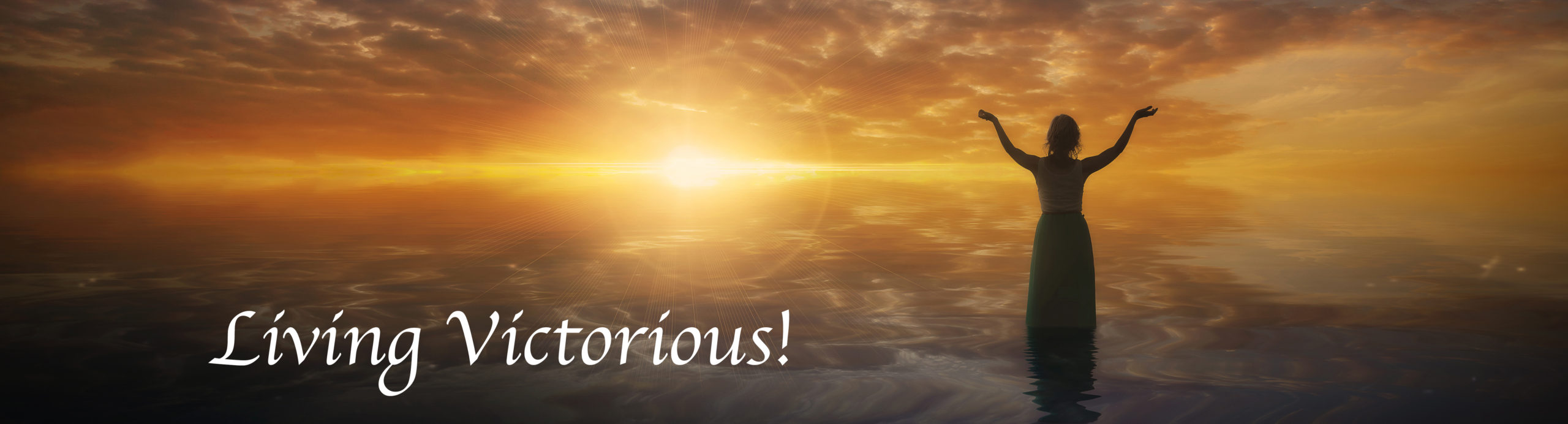 A woman lifts her arms in praise as the sun sets